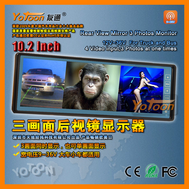 10.2寸后视镜产品说明: 屏幕尺寸:10.2寸(16:9/4:3) 像素点:640 X RGB X 480 制式:PAL/NTSC制式 视频:四路视频输入,AV1/AV2/AV3/AV4 画面显示功能,带触摸按健 操作方式:摇控、按键。 颜色:黑色 |
